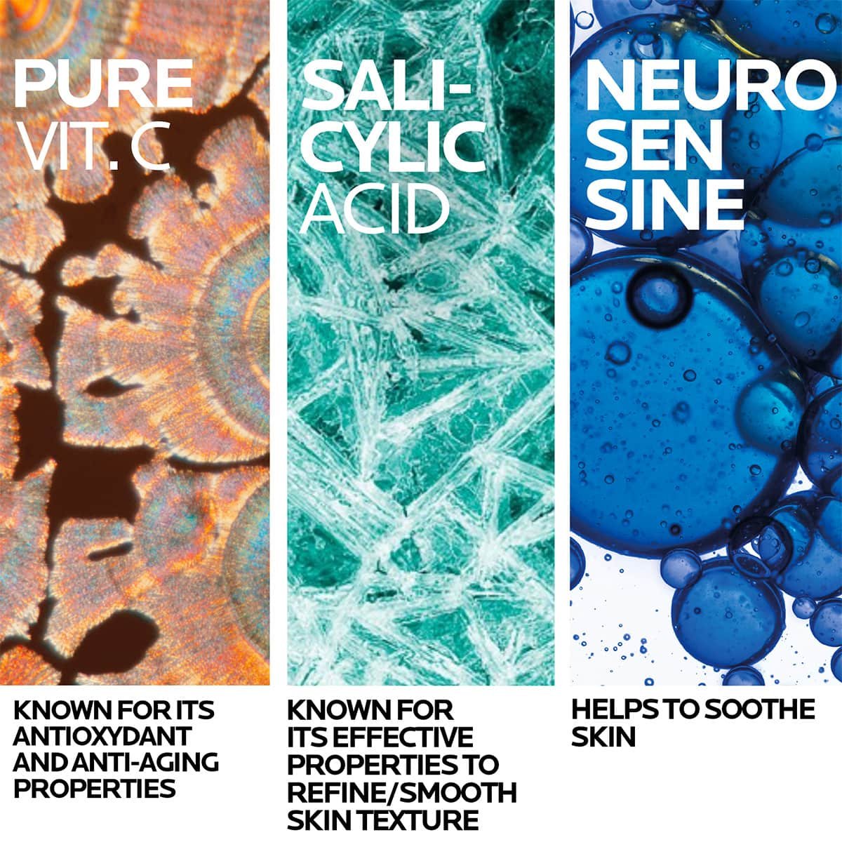La Roche-Posay pure vitamin C12. Antioxidáns, regeneráló ránctalanító szérum. Érzékeny  bőrre is megfelelő. JAVALLAT: Ráncokra. Ragyogását vesztett bőrre. Egyenletlen bőr textúrára. INNOVÁCIÓ: Különleges regeneráló öregedésgátló szérum magas C-vitamin koncentrációval, amely antioxidáns hatású. Szalicilsavval és Neurosensine-nel, hogy nyugtassa a bőrt  és felfedje az érzékeny bőr ragyogását.